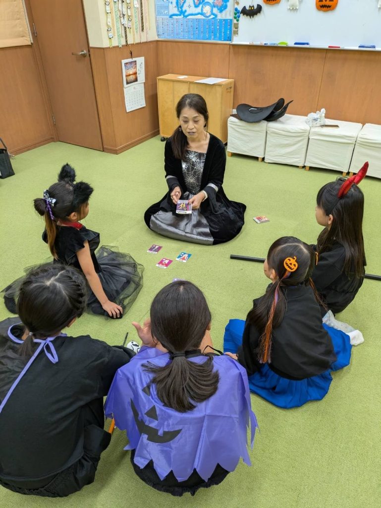 続いては、ハロウィーンに関連する英単語のカルタ遊び。“ghost”“pumpkin”“witch”など、耳にするだけでワクワクする単語ばかり。カードを見つけるたびに歓声が上がり、少人数ながらも活気のある時間になりました。