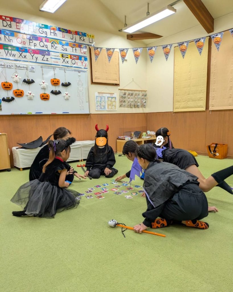 10月25日に、教室でHalloween Partyを開催しました。今年は体調不良などでお休みの子が多く、いつもより少人数での開催となり、少し寂しさもありましたが、その分ひとりひとりとじっくり関わることができ、温かい雰囲気のパーティーとなりました。何より子供たちのコスチューム姿がかわいい!