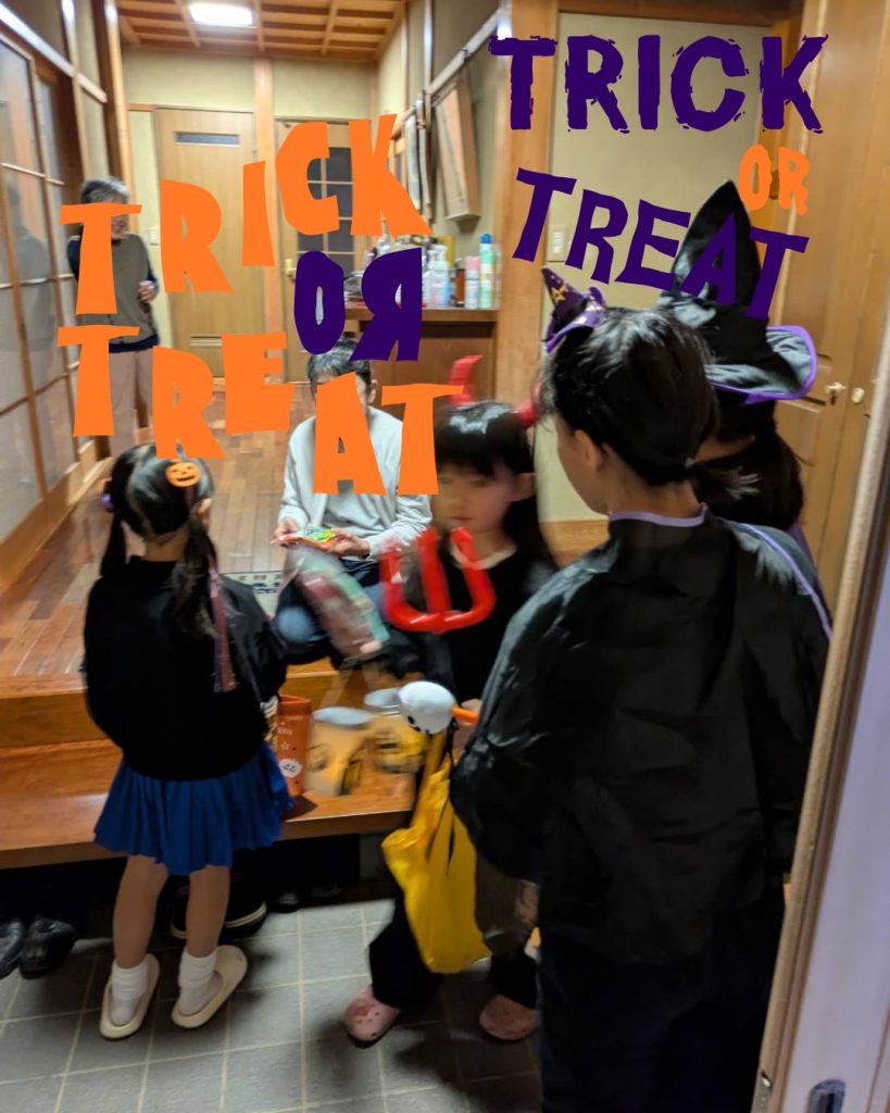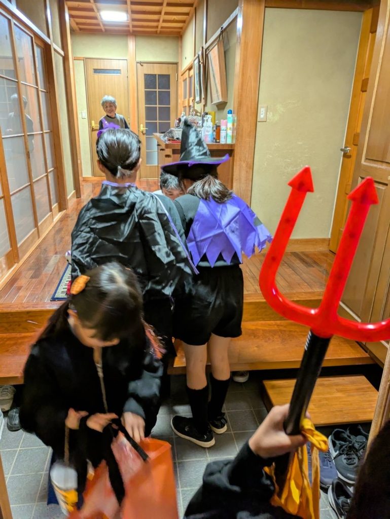その後は、近所のお家へTrick or Treatingへ。ご協力いただいたご家庭から温かく迎えていただき、子どもたちは「Trick or Treat!」と元気に挨拶してお菓子を受け取りました。少し緊張しながらも上手に挨拶できて、ほっとしたような表情が印象的でした。