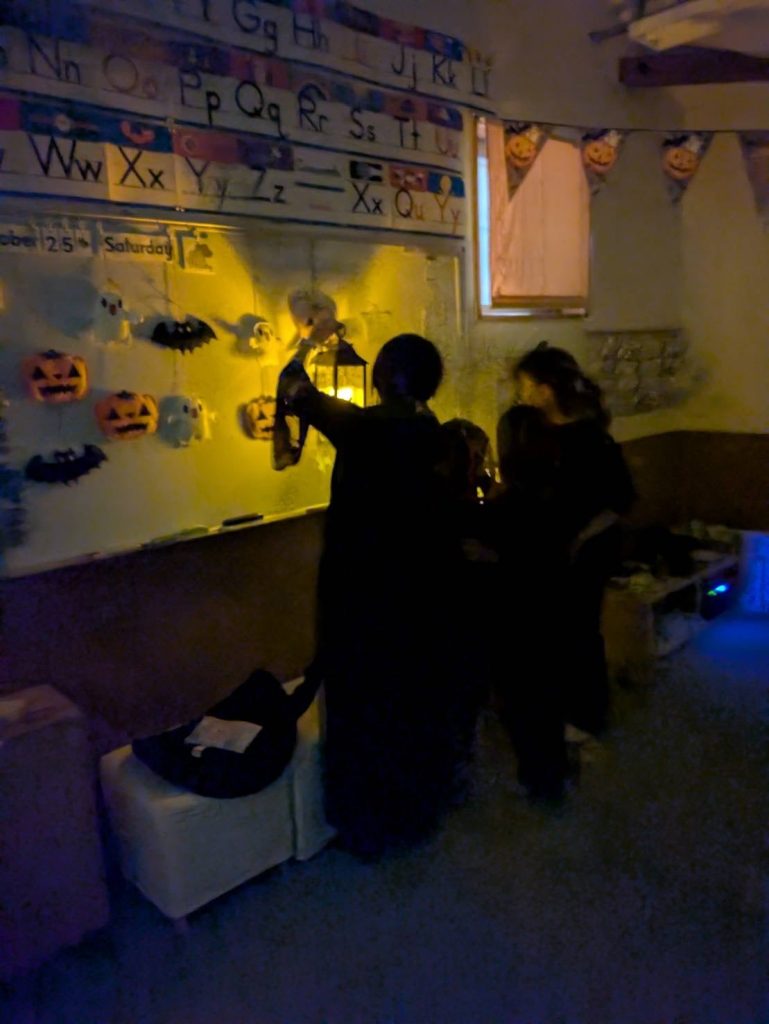 最後のアクティビティは、教室を使ったHaunted House。明かりを消した暗い部屋の中、自分で作ったランタンの光だけを頼りに、隠されたskeletonのパーツを探すゲームです。見つけたパーツを組み立てていくと、だんだん骸骨の形が完成していき、子どもたちは夢中になって探索していました。